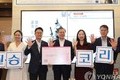 「必勝コレア」と書いたカードを手にNK農協職員と記念撮影をする文在寅大統領(聯合ニュース8月26日付より)