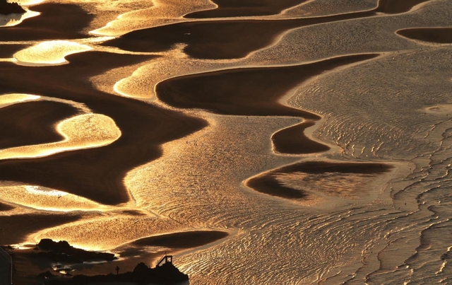 遠浅の海が広がる兵庫県たつの市御津町の新舞子海岸で、干潟の模様が朝日に浮き上がる光景が写真愛好家らを魅了している。冬から早春にかけた季節は日の出のころに大きく潮が引くため、刻々と移ろう光のショーが楽しめる。