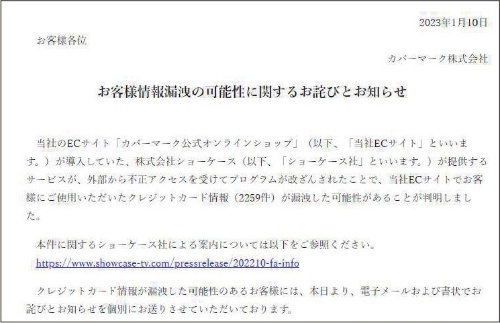 カバーマークの発表によると、同社が運営するECサイト「カバーマーク公式オンラインショップ」の顧客のクレジットカード情報2259件が流出した可能性があるという。カバーマーク公式オンラインショップでは、ショーケースのサービス「フォームアシスト」と「サイト・パーソナライザ」を利用していた。